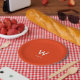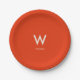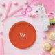 Trendy personal party paper plates featuring muted red background, large centred monogram and associated name. Clean, simple minimalist typography. Fully personalizable.