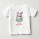 Adorable drawing of a white bunny with big blue eyes holding a blue Easter egg. The name Jennifer is written in a beautiful pastel coral colour typeface and should be changed for the child the shirt is for. Under the name is the message "My 1st Easter" which can be changed to whatever year is suitable. It is also in the same colour as the other text. This t-shirt is available in other sizes, from 6 months up to 24. You can also change the shirt colour, but make sure to choose from the "Vivid Printing, White Underbase" print process or the colours of the illustration won't remain safe.