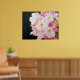 Delicate pink blossoms cluster together with soft petals and vibrant yellow centres, set against a dark background that enhances their vividness. The composition captures the flowers in full bloom, showcasing their intricate details and natural beauty.