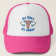 Pro-choice word art trucker hat features "my body my choice" in retro style blue text with floral uterus graphic.