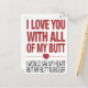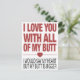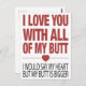 My Butt Funny Valentines Postcard - Ah Valentines Day that sacred day for lovers all over the world. Celebrate your Valentine with this hilariously honest and quirky postcard: "I love you will all my Butt. I should say my heart but my butt is bigger" This postcard will hopefully melt the heart and tickle the funny bone of anyone who receives it. No butts about it.
