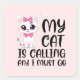 Answer the call of feline love with this 'My Cat Is Calling and I Must Go' sticker! Featuring an elegant white cat adorned with a soft pink ribbon, this charming artwork is perfect for cat enthusiasts who know the undeniable pull of their beloved pets. A delightful gift for cat lovers, this design adds a touch of sophistication and humour to your day.