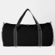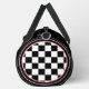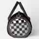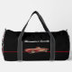 This sleek duffel bag has a sleek sporty look that features a subtle nod to classic cars. This black bag has an image of a vintage, red Corvette on the front. On the sides there is a black and white chequered pattern. The text an be customised.