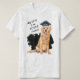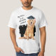 An image of a golden retriever wearing a graduation cap with red tassel is portrayed against an abstract black background on this shirt. At the upper left is your custom text, also in black. Currently it says "My DOG is an HONOR student", but you may easily change it or remove it.