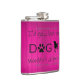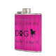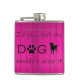 A perfect flask for those who prefer the company of dogs and the comforts of home! This flask design features text that says "I'd go...but my dog wouldn't allow it." with a paw print and dog silhouette embellishment against a magenta wooden background. Additional gift items available with this design as well.