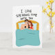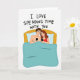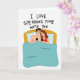 This funny greeting card shows a happy couple tucked into bed together, smiling as they relax side by side. The man and woman are drawn with simple, modern lines, and they’re covered by an aqua-blue blanket with soft blue pillows behind their heads. A warm yellow headboard frames the top of the bed, giving the scene a cozy, homey feel. Both of them are holding smartphones, and the screens cast a small glow that hints they’re sharing a quiet moment while still doing their own thing. At the top of the card, the message “I LOVE SPENDING TIME WITH YOU” appears in a hand-drawn script, set in dark lettering against the white background. The plain white space around them keeps all the focus on the couple and the sweet message, making it feel calm and intimate ❤️💌. It’s a simple reminder that love can look like comfort and togetherness, even on an ordinary night 🍫.