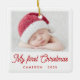 First Christmas photo ornament featuring your custom baby photo and red text “My first Christmas” in a festive, retro style font with customizable name and year below. Double sided printing with space for two photos.