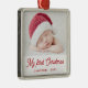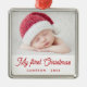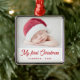 First Christmas photo ornament featuring your custom baby photo and red text “My first Christmas” in a festive, retro style font with customizable name and year below.