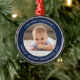 Celebrate the simple joys of your newest family member with a navy blue and white custom photo new baby boy round metal ornament. Wording and picture on this template are simple to personalize. "My First Christmas" quote is easy to change in case it's needed for another occasion. (IMAGE & TEXT DESIGN TIPS: 1) To adjust position of wording, add spaces at beginning or end. 2) To center the photo exactly how you want, crop it into a square shape before uploading to the Zazzle website.) Design features one picture of your choice, a modern minimalist navy blue and white border, and simple elegant typography. This unique family keepsake adds an elegant touch to Xmas holiday home decorations.