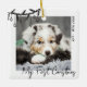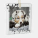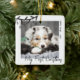 Celebrate your furry friend with this square Christmas ornament. The front highlights a large photo, accented with a black doodle swag of pine greenery and hanging ornaments in the top left corner, slightly overlapping the image for a casual hand-drawn look. In the centre, the phrase “My First Christmas” appears in a black script calligraphy style. The top right has space for your pet’s name and the year in a simple handwritten font for a sweet personalised touch.