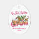 Modern Brush Script My First Christmas Baby Ornament includes Watercolor Gingerbread Train with candy, cookies and pines. Pink.