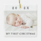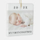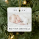 White, ceramic ornament featuring your custom photo, the year and custom text "My first Christmas".