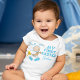 Cute baby outfit in pastel blue writing for a baby's 1st Easter personalised with your child's name. Adorable image of an infant dressed in a bunny suit holding a rabbit next to a chick by www.prettygrafik.com