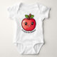 A charming baby bodysuit in a soft, pastel hue, designed to celebrate a little one's first Rosh Hashanah, features an adorable kawaii-style red apple at its centre. The apple, with its round, chubby shape, shiny red skin, and a sweet smile complete with sparkling eyes and rosy cheeks, exudes pure joy. Below the image, the bodysuit showcases a customisable caption in a playful, rounded font, reading "It's my first Rosh Hashanah!"—a delightful and personal touch to commemorate this special occasion.