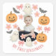 Make your baby’s milestone extra special with this adorable My First Halloween Baby Sticker. Featuring a playful wreath of pumpkins, ghosts, candies, flowers, and leaves surrounding your baby’s photo, this sticker is perfect for decorating favour bags, gifts, invitations, or keepsakes. Personalise it with your little one’s name and “My First Halloween” text to create a unique and charming touch for parties and celebrations. A sweet way to remember your baby’s very first spooky season!