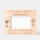 Commemorate a special milestone with this beautifully engraved wooden frame, featuring "My First Holy Communion" etched at the top, with space for the church and child's name at the bottom. A chalice with a wafer and a simple cross add meaningful detail. This customisable frame is the perfect way to preserve memories of a cherished day. Ideal as a gift or keepsake, it combines classic design with heartfelt personalisation for a lasting impression. Edit text from the product page or to change font style, use the design tool.
