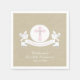 Add this personal touch to your daughter's First Holy Communion party. These napkins can also be used for a baptism or Christening. Add personalised napkins. There's light brown textured background with a banner that reads "My First Communion" with doves on each side holding it with a light pink cross in the centre of a white circle. Personalise with name and date of party. You can customise the font style, colour, and style.