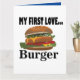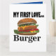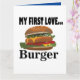 My First Love Burger Greeting Card designed by Nisha Prabhu. Featuring yummy delicious Burger graphic digital illustration with funny typography ''My First Love...Burger.'' Send a deliciously delightful message with this First Love Burger Greeting Card! Whether you're celebrating a special occasion or just want to brighten someone's day, this fun and whimsical card is sure to bring a smile to their face. Featuring a playful burger design that pays homage to everyone's favourite comfort food, this greeting card is perfect for burger enthusiasts and food lovers alike. Share your love for burgers and spread some joy with this unique and flavorful card. Let your recipient know they're special with a touch of burger love and a heartfelt message inside this tasty greeting card!