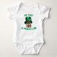 Cute "My First St. Patrick's" day baby bodysuit. Design features a puppy dog wearing a green leprechaun hat and green text.