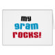 My Gram Rocks T-shirts, cards, stickers, tote bags, magnets, buttons, and other items with a black, blue, and red text design. These My Gram Rocks items are a great way to show your love for your special gram!