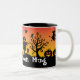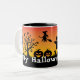 halloween backrgound with scarecrow, spooky pumpkins and a witch