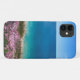 Original digital painting of a view from a Cornish clifftop. Set in June when the thrift (sea pink flowers) are in bloom, and the sea looks tropical and warm in shades of teal, green and blue. Soft clouds dot the blue sky, and a sliver of tan and pink sand is visible. The piece has texture and brush strokes. The perfect phone case for beach lovers, and those who love Cornwall.