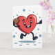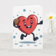 This Valentine’s Day card features a bright red heart brought to life with cheerful eyes, raised brows, and a wide, happy smile. The heart looks glossy, as if painted with smooth enamel, and stands out against a crisp white background. Caught mid-step, it appears to be running or skipping with excitement. Tucked under one arm is a classic brown football with white laces, adding a sporty touch. The other arm points forward with confidence and energy. Soft shadows beneath the heart give it motion, while floating blue circles in the background add balance and charm. With no words needed, this card delivers joy, love, and enthusiasm in a fun, spirited way.