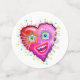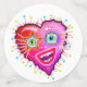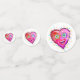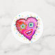 A smiling, contemporary art style emoji as a red heart shaped emoticon face in the bright, colourful Valentine colours of red, pinks, magentas and purples accented with other complementary colours.