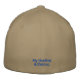 Embroidered hat with image of man wearing camo, holding a hunting rifle and fly rod.