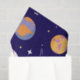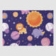 a space-themed pattern. This pattern features a variety of celestial objects and animals. There are planets of different sizes and colors, such as purple, orange, and yellow, along with a bright sun. Additionally, there are animated animals, including a pink elephant, a yellow lion, and a purple hippopotamus, floating amidst the celestial bodies. The background is a deep black, accentuating the bright colors of the planets and animals.