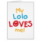 My Lolo Loves Me T-shirts, bodysuits, cards, stickers, mugs, bags, magnets, and more with a colourful blue, red, and yellow text design.
