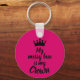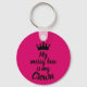 Round button keychain features fun text "My Messy Bun is My Crown" and a crown on hot pink background. Keychains make memorable gifts for family and friends or create for yourself.