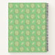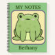 On the front is a green kawaii frog inside a yellow square in a green background. Above the frog reads My Notes while below there is space for your name. Both of these are templates you can use to personalise this design. On the back is a repeat pattern of the same frog with green leaves on a green background.