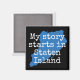 Did you grow up in Staten Island? This magnet is for you. It reads: My story starts in Staten Island. White lettering on blue map of Staten Island New York. Background colour is black.