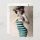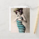 Vintage photo of a young woman in a striped bathing suit. She's wearing a hat with pink bows and he's holding a broken strap in place