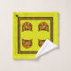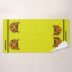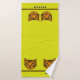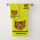 This thick, velvety towel set features a cute cartoon style tiger cub's face in orange & black tiger on a bright puce (yellow-green) background w/ alternating black & orange borders above a wide puce band at bottom. Bath size is ready to personalise w/ your (or your kid's) name, hand towel has space for a monogram, washcloth has initial.
