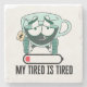 This image features a cartoon illustration of a teacup with a tired expression. The teacup is depicted with large, droopy eyes, a furrowed brow, and a slight frown. It has a light blue body and dark green legs. The teacup is holding a lightning bolt icon, suggesting it is out of energy. Below the teacup is a battery icon with a red bar indicating low power. The text "My Tired is Tired" is written in bold, black letters underneath the battery icon. The image humorously portrays the feeling of being exhausted and depleted of energy. The playful design and relatable message make it a fun and engaging illustration.