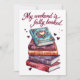 A cosy book lover quote celebrating weekends spent reading. Decorative stacked books with hearts create a warm and relaxed reading mood for people who love quiet time with stories.