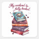 A cosy book lover quote celebrating weekends spent reading. Decorative stacked books with hearts create a warm and relaxed reading mood for people who love quiet time with stories.