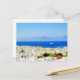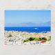 Classic whitewashed buildings line the labyrinthine streets of Mykonos, vintage postcard.