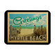 This Greetings From Myrtle Beach vintage postcard design features a sandy beach with a beautiful turquoise ocean water and above the sea, a blue sky with billowy white clouds. In vintage travels style.