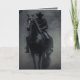 Step into a world of intrigue with our Mysterious Dark Stranger Halloween Greeting Card! This enigmatic figure, clad in all black, rides his black horse through the depths of a misty, foreboding forest.