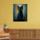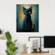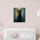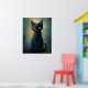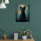 A stylized digital painting of a black cat with piercing yellow eyes, seated against a moody abstract background of teal, blue, and orange. The expressive brushstrokes and shadowy tones evoke mystery and elegance. This piece blends realism with atmosphere, perfect for lovers of feline art and dark aesthetics.