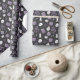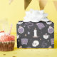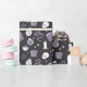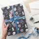 Spooky chic wrapping paper features a pattern of snakes, mystical crystals, potions, spellbooks, candles, jars, skulls, tarot cards, and potions on a charcoal background.