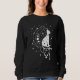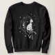 Line art illustrations of a cat sitting on a moon surrounded by stars and crystals.
