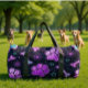 This unique duffle bag features a colourful pattern of glowing purple and pink paw prints, bones, and teal stars and heart design outlines, all set against a dark, cosmic background. It's a stylish pet accessory and versatile travel organiser, perfect for the pet lover with a mystical flair.