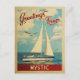 This Greetings From Mystic Connecticut vintage travel nautical design features a boat sailing on the water with seagulls and a blue sky filled with gorgeous puffy white clouds.