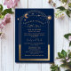 Mystical Blue Gold Sun Moon Stars Baby Shower Celestial Gender Reveal Baby Shower Invitations features a gold sun, moon and stars frame on a blue background with your menu details in the centre in modern gold calligraphy script. Inside is your custom baby shower and gender reveal invitation information. Personalise by editing the text in the text boxes. Designed for you by ©2022 Evco Studio www.zazzle.com/store/evcostudio