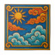 Journey to a realm of vibrant skies with this captivating decorative tile. Featuring a radiant sun and dramatic clouds. A rich palette of blues, oranges, and gold, this decorative accent piece adds a mystical and energetic touch to any space. Perfect for infusing your home with the "power" and beauty of the elements. The bold golden border with elegant corner flourishes adds a touch of classic artistry. Its bold colours and intricate design create a powerful and artistic statement. The stylised sun and dynamic clouds in rich blues, oranges, and gold create a mesmerising visual narrative. An ideal accent for those seeking a piece that is both artistic and symbolic.