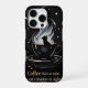 This stylish iPhone 16 Pro Case features a poetic design of a black cat silhouette emerging from a steaming cup of coffee under a starry night sky with the phrase "Coffee black as night, a cat's shadow in sight."